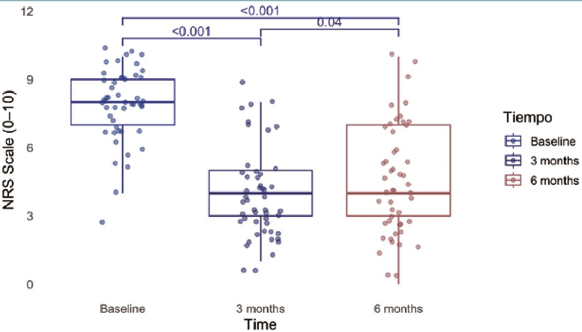 Figure 2. Comparison of NRS (0-10) before and after spinal cord stimulation across all patients at baseline, 3 months, and 6 months. Friedman test followed by pairwise Wilcoxon comparisons with Bonferroni correction was used.