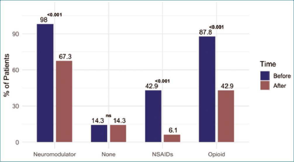 Figure 3. Comparison of the proportion of patients using each medication type before and 6 months after spinal cord stimulation. McNemar test was used for paired comparisons of pre- and post-implant medication use. NS: not significant.