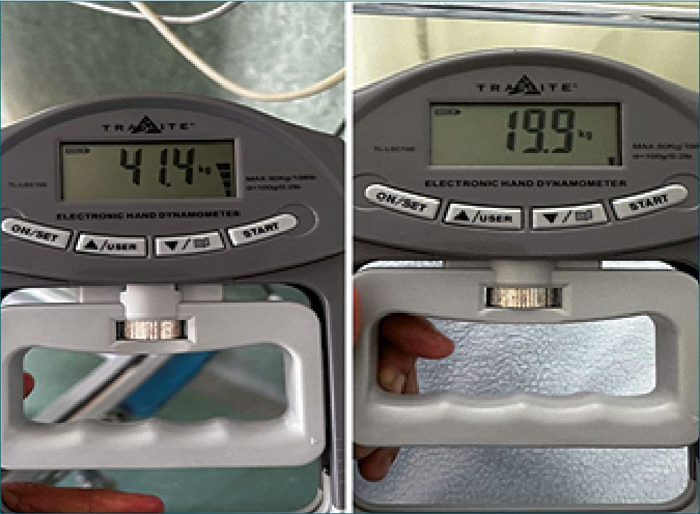 Figura 1. Dinamómetro utilizado para valorar pérdida de la fuerza muscular. Izq: prebloqueo, Der: postbloqueo.