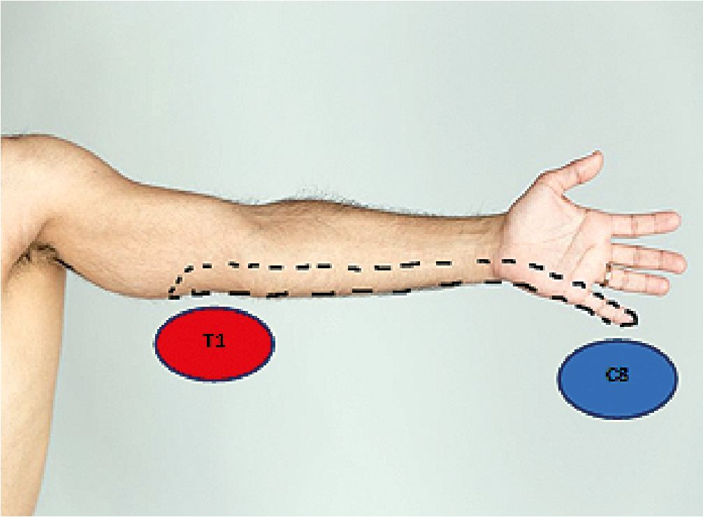 Varios estudios anatómicos discrepan en cuanto al volumen inyectado y su posterior distribución. Cros et al. (2019)[8], usaron 5 ml entre la división anterior y posterior del TS, donde la distribución de la tinción fue hasta el tronco medio, quedando exento el TI. Frederico et al. (2022)[9], también con 5 ml de azul de metileno a nivel del tronco superior, se observó limitación a las raíces C5 y C6. Trivedi et al., usaron 12,5 ml de AL en una sola punción entre el tronco superior-medio y 12,5 ml entre el medio-inferior obteniendo bloqueo sensorial y motor completo del nervio cubital. Esta variación del volumen administrado podría influir en nuestros resultados, debido a que nosotros empleamos 15 ml a nivel del TS y tuvimos afectación parcial del TI, muy limitada a nivel de la raíz de C8 y con preservación en la mayoría de los casos de T1.