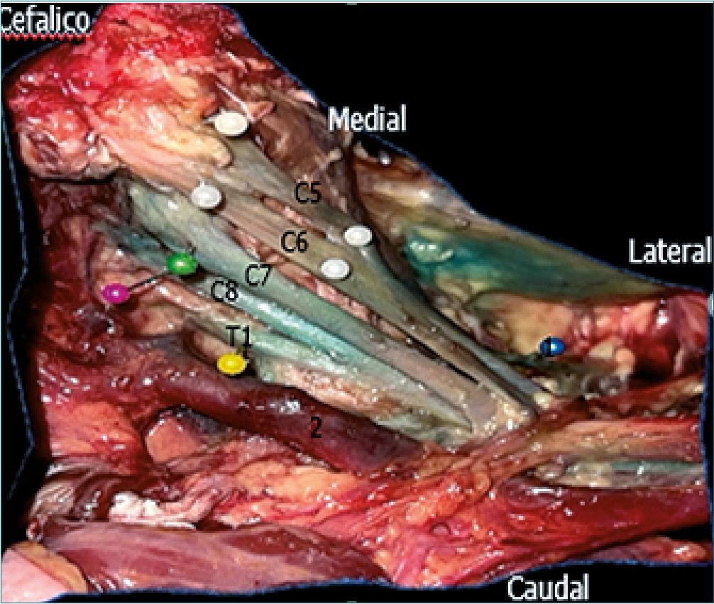 Disección del cadáver: se realizó disección plano por plano en 12 extremidades superiores desde la región cervical hasta la fosa axilar, identificando todos los componentes del plexo braquial y la tinción de los mismos.
