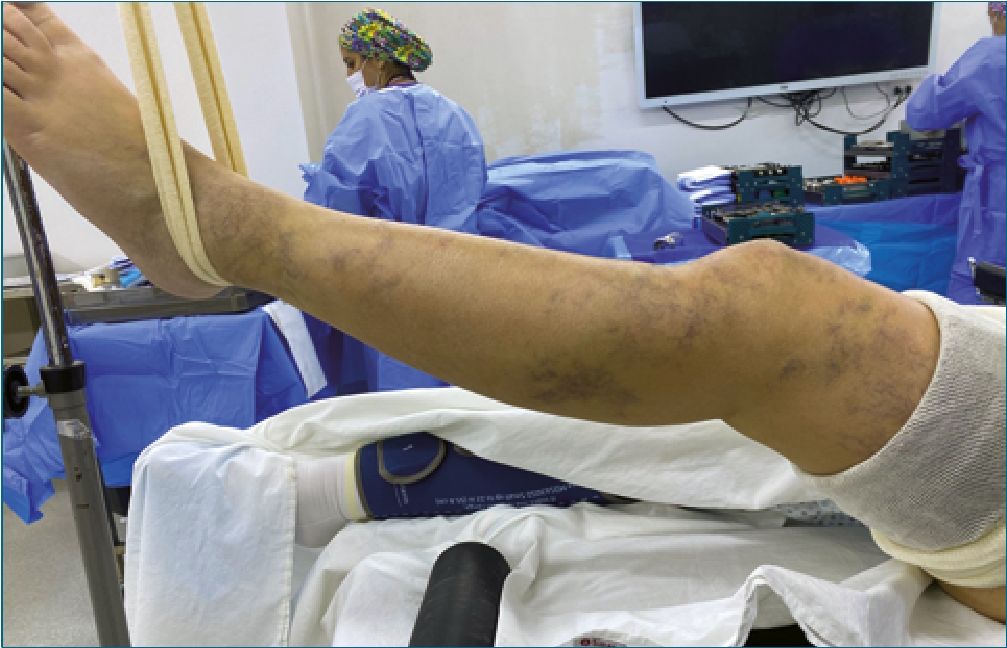 En sus exámenes preoperatorios presentó un hematocrito de 40%, hemoglobina 13,6 g/dL, plaquetas 238.000, PT 97%, TTPa 31 seg, INR 1,02, fibrinógeno 133 mg/dL y dímero D 12,77 ng/mL. Ecocardiograma normal. La resonancia magnética (RM) describió una gonartrosis tricompartimental y malformaciones arteriovenosas en celular subcutáneo. La angiotomografía computarizada informó: estructuras varicosas dependientes de vena safena, sin patología arterial. La ecografía doppler venosa detalló cambios postquirúrgicos/post flebíticos en la vena femoral, insuficiencia venosa y formación de várices, con importante cantidad en el aspecto anterior de la rodilla, muslo distal y pierna proximal.