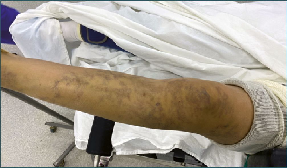 Al examen físico: índice de masa corporal de 26, sin predictores de vía aérea difícil (VAD), y abundantes telangiectasias, manchas vasculares y várices en la extremidad inferior izquierda (Figuras 1 y 2).